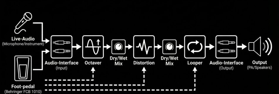 This project transforms a laptop into a modular, programmable effects rig, replacing hardware pedals with custom code. Designed specifically for live performance with monophonic instruments (e.g., Trumpet), it explores the boundaries of software-defined instrumentation where stability and low latency are paramount.
