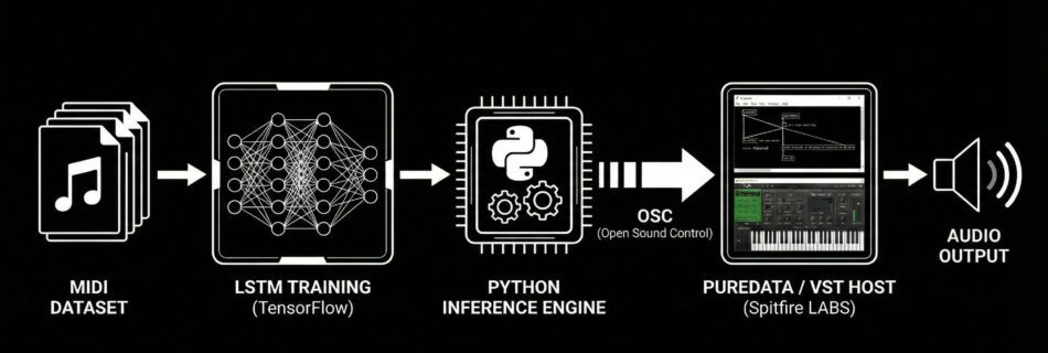 Trained on datasets of classical composers (e.g., Bach, Beethoven), the system now operates in two distinct modes: a high-performance Desktop Mode connecting Python to professional audio engines, and a highly accessible Web Mode running entirely client-side in the browser. Both versions feature a custom state-machine to handle complex voice allocation and allow the performer to modulate generation parameters—such as „Temperature“ (creativity) and „Density“ (sparsity)—live during performance.