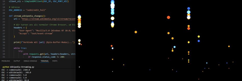 This cross-medial generative art installation transforms the global pulse of human knowledge into a real-time audiovisual experience. By connecting to the live stream of Wikipedia edits, the system translates abstract metadata—such as byte size, user type, and edit wars—into organic soundscapes and dynamic particle visualizations.